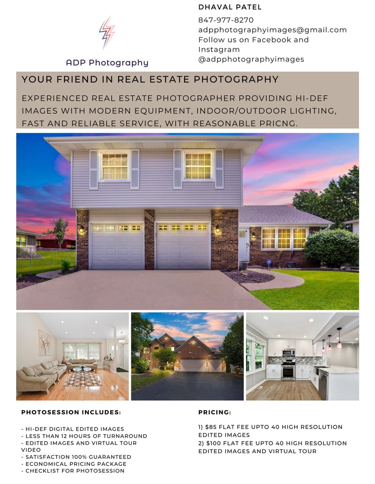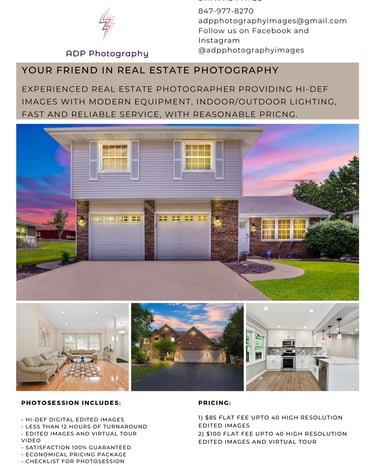 This project involved creating a modern, easy‑to‑read flyer that showcases ADP Photography’s real estate photography services in Chicago. The design works seamlessly online and in print, helping them promote listing photography, drone imagery, and property visuals to local agents.